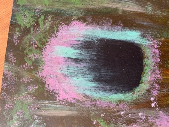 This is one of my favorite details of the piece because it really exemplifies the techniques I used to replicate nature. I tried to create a mossy flowery cover over the trees, and I used stippling in order to achieve this. I also wanted moss to hang over the tree holes, so I used small amounts of paint and light strokes to accomplish that detail.