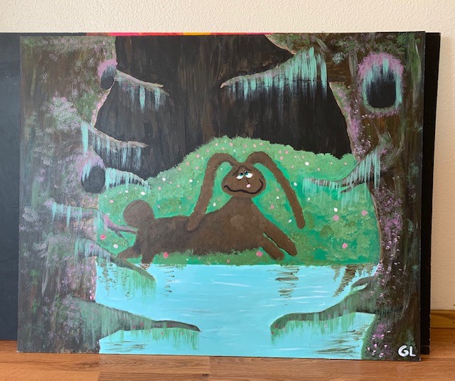 This painting was extremely fun to create since we had so much artistic freedom. I wanted to do a landscape painting, and I wanted to draw inspiration from my favorite anime artist, Hayao Myazaki. The creature that I created for this piece is named Tuffy, and I created it with different style brushstrokes in order to make it look fussy, rather than furry. I used Gelkyd on the water as a medium in order to add shine and evenness. For the underpainting, I painted the dark areas and the trees in pure black, and I used black for Tuffy’s underpainting. I worked the brown acrylic over the black and used it as natural shadow. One of my favorite details in this piece is the way I accomplished Tuffy’s foot dipping in the water, and the trees’ reflection.